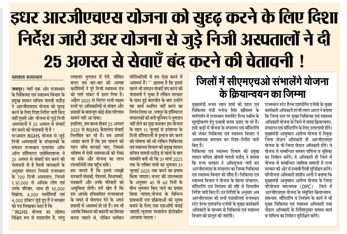 जहाँ एक ओर राजस्थान के चिकित्सा एवं स्वास्थ्य विभाग के प्रमुख शासन सचिव गायत्री राठौड़ ने आरजीएचएस योजना को सुदृढ़…