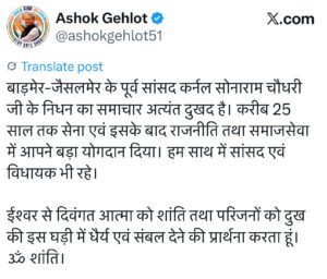 निधन पर पूर्व मुख्यमंत्री अशोक गहलोत ने शोक व्यक्त करते हुए ट्वीट किया कि